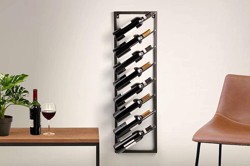 Ein Flaschenregal für die Wand hat aus Gründen der begrenzten Belastbarkeit zwar nicht so viel Platz wie ein stehendes Modell, dennoch spielt die Optik hier eine große Rolle. Die moderne Weinhalterung besteht aus Metall und hat ein Eigengewicht von 2,2 Kilogramm. Die schwarze Farbe fügt sich gut in sämtliche Einrichtungsstile ein und kann eine nette Dekoidee sein.